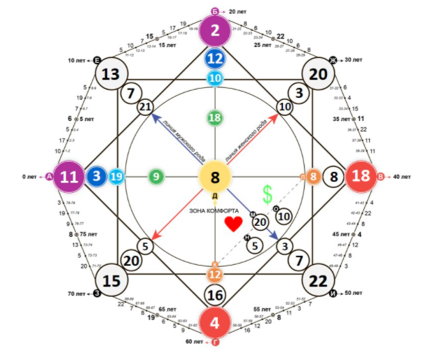 A complex circular chart with various numbers, colors, and symbols, possibly depicting a numerology or astrology chart.